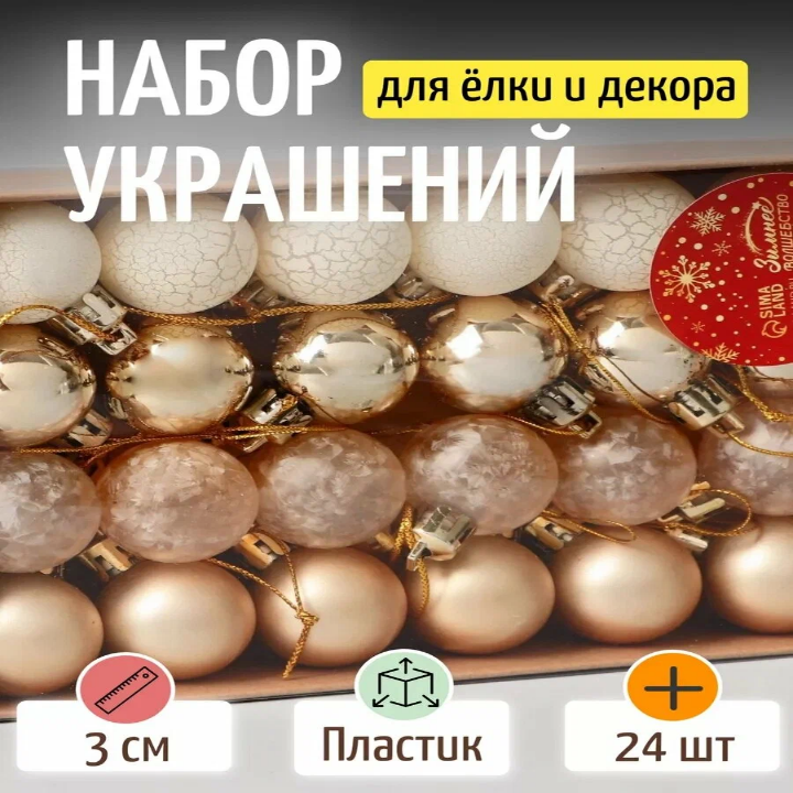 Ёлочные игрушки, шары новогодние , пластик, набор d-3 см, 24 шт